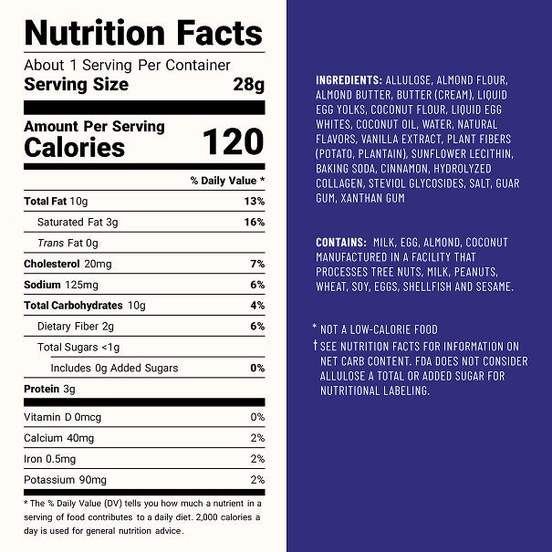 Ingredients: Donut (Water, Soluble Tapioca Fiber, Blanched Almonds, Sustainable Palm Oil, Allulose, Dried Whole Eggs, Coconut Flour, Plant Fibers (Potato, Plantain), Cream Powder (Cream, Nonfat Milk), Natural Flavor, Xanthan Gum, Cinnamon, Aluminum Free Baking Powder (Sodium Acid Pyrophosphate, Sodium Bicarbonate, Cornstarch, Monocalcium Phosphate), Sea Salt, Steviol Glycosides), Chocolate Flavored Icing (Allulose, Sustainable Palm Oil, Cocoa Powder, Sunflower Lecithin)